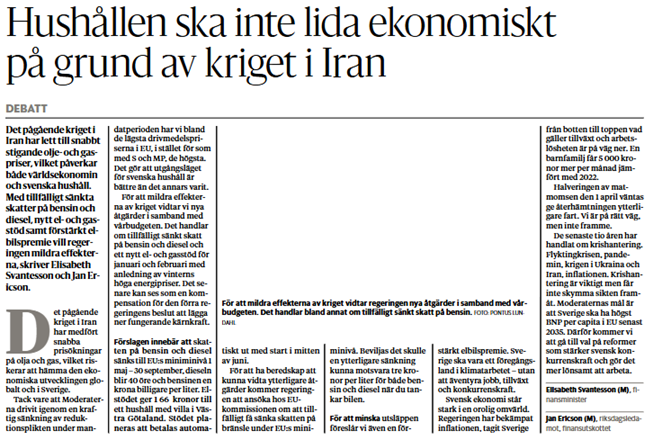 Regeringens vårbudget fortsätter att stödja hushållen i en tuff tid. I morgon kommer ett längre inlägg där jag sammanfattar regeringens samlade ekonomiska politik för 2026. Här lämnar finansminister Elisabeth Svantesson över vårbudgeten till talmannen före dagens debatt.