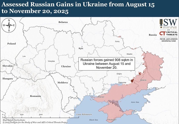 När invasionskriget tog fart med Rysslands storskaliga anfall 24 februari 2022 kontrollerade Ryssland redan ca 7% av Ukraina (Krim och delar av Donetsk och Luhansk). Idag efter snart fyra års krig (!) kontrollerar ryssarna ca 18%. Man har tagit 11% av Ukrainas yta på 45 månader. Det betyder 0,24% per månad. I den takten tar det drygt 340 år att ta resten. Ukraina har dessutom lyckats försvara alla sina stora städer, och tagit tillbaka Kherson som under en tid var ockuperad.