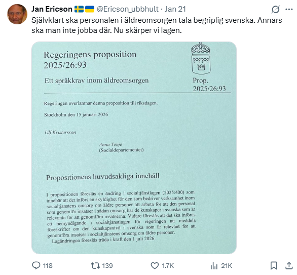 * Den 1 juli införs språkkrav inom äldreomsorgen, för att äldre ska kunna förstå och göra sig förstådda. Det handlar även om medicinsk säkerhet. Språket spelar också en viktig roll för en god arbetsmiljö för alla som arbetar i äldreomsorgen – för att personalen ska kunna trivas, samtala och känna en gemenskap utan missförstånd och frustration.
