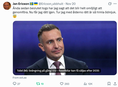 Sedan det tyska valet har det rört på sig, Tysklands nya förbundkansler har varit tydlig i frågan. även om EU-kommissionen med tysk ordförande (von der Leyen) spjärnat emot. På EU-mötet i Billund där jag närvarade i höstas uppmärksammade jag detta och hade samtal med representanter från tyska Bundestag. De tyckte precis som jag, att förbudet måste rivas upp. Annars dör tysk bilindustri och tar med sig resten av Europa in i en djup kris.