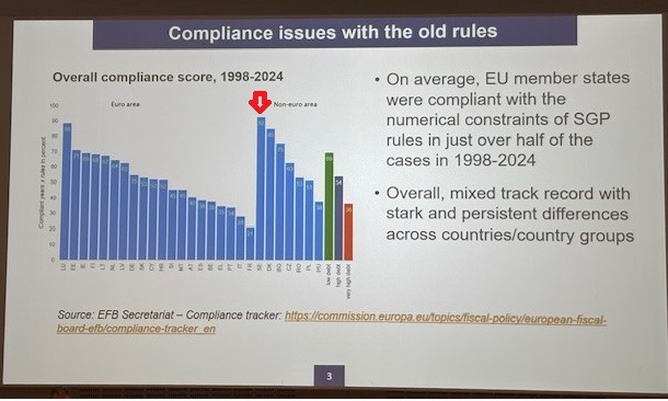 En av föredragshållarna presenterade denna bild som visar att Sverige just nu har EU:s absolut starkaste statsfinanser, före Luxemburg och Danmark. Detta gör dock inte att Sverige kan vara hela EU:s bankomat med fri uttagsrätt.