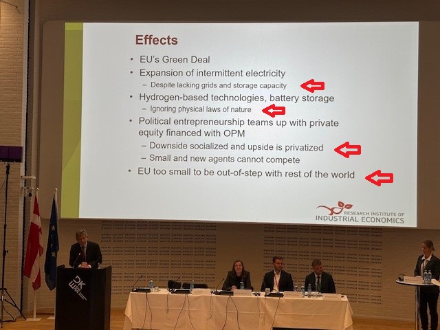 En av de inbjudna talarna var den svenske professorn Magnus Henrekson. Han ägnade en stor del av sitt anförande åt att rikta den hårdaste kritik jag hittills hört på en EU-konferens om EU:s klimatpolitik och satsningar på grön omställning. Kritiken gällde att detta medför försämrad konkurrenskraft och oerhörda kostnader. Detta är en av de bilder han presenterade, den talar för sig själv. Kritik mot att
