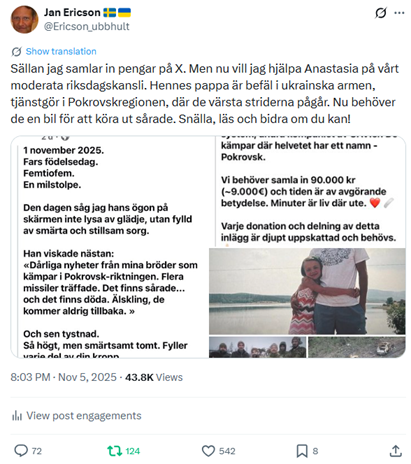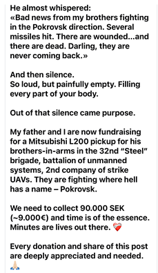Ni minns insamlingen vår moderata politiska sekreterare Anastasia startade för att köpa en bil till sin pappas stridskamrater i Pokrovsk-regionen i Ukraina? Insamlingen nådde snabbt målet och i helgen som gick kördes bilen ned till Cherkasy i Ukraina (ca 20 mil sydost om Kyiv). Anastasia var själv med under transporten. Igår på själva julafton lämnade hon personligen över nycklarna till bataljonen. Nu kommer bilen att bland annat användas för att köra ut skadade från stridsområdet för vård. Tack alla ni som bidrog, ni har hjälpt till att rädda liv! Detta blir för min del årets julklapp!
