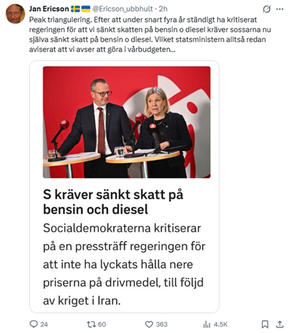 Just nu stiger drivmedelskostnaderna till följd av krig i världen, men i varje läge hade kostnaden varit minst 6-7 kronor högre för diesel och 3-4 kronor för bensin, oavsett marknadspriser i övrigt, om vi inte minskat reduktionsplikten och sänkt drivmedelsskatten. Om man även tar med den planerade höjningen av reduktionsplikten som år efter år skulle fortsatt att öka literpriset hade priset varit ännu högre. Det finns all anledning att påminna om detta. Dagens höga literpris hade varit extremt mycket högre utan regeringens politik. Frågan varje väljare bör ställa är om man vill betala 35-40 kronor per liter diesel eller dagens 17 kronor?