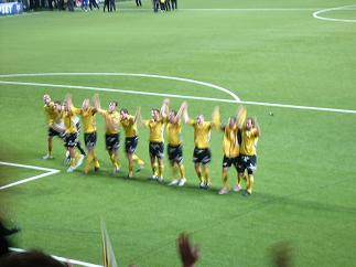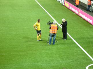 Bilden till vänster: Glada spelare tackar oss i ståplatspubliken efter matchen. Högra bilden: Anders Svensson, som alltid lysande när han möter Blåvitt, intervjuas efter matchen.