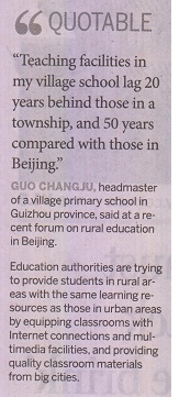 I den första lilla artikeln beklagar sig en rektor för en landsbygdsskola över att hans skola ligger minst 20 år efter skolorna i närliggande städer och 50 år efter skolorna i huvudstaden Beijing när det gäller skolans utrustning för undervisning i form av internet och multimedia. Liknande tongångar, om än inte så dramatiska, här vi emellanåt från företrädare för mindre skolor på landet även i Sverige.