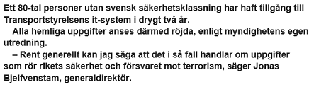 Transportstyrelsen har nu presenterat sin egen utredning om den allvarliga säkerhetsläckan. Och den var om möjligt värre än väntat. Till och med Aftonbladet ägnar lång artikel åt saken i dagens tidning, och skrev även om saken i går. Man konstaterar bland annat att "alla hemliga uppgifter anses röjda". Det handlar exempelvis om ritningar över broar och brofästen (intressant för den som eventuellt vill utföra sabotage eller terrorangrepp), hälsodeklarationer i samband med körkortsprövning och identiteten på fordon som tillhör Försvarsmakten (intressant för en eventuell angripare).