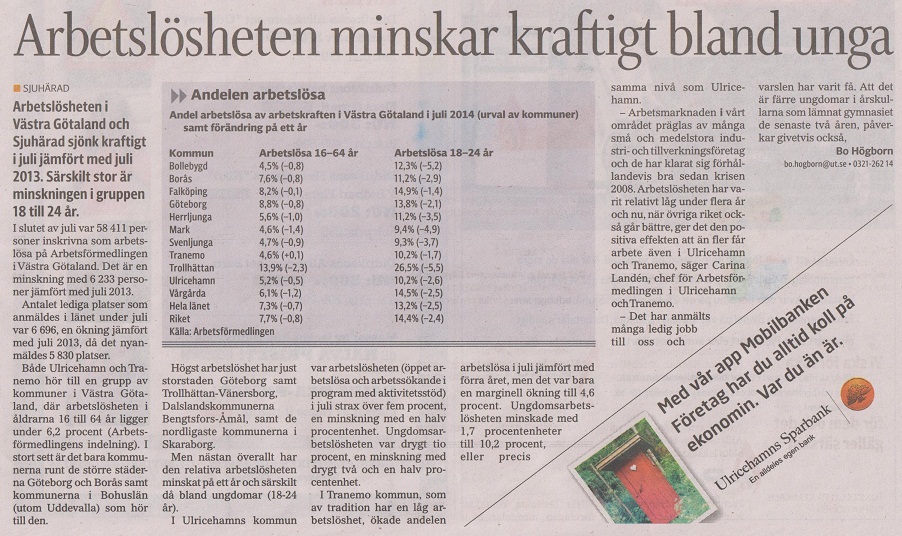 I dag presenteras Arbetsförmedlingens senaste månadsrapport. Arbetslösheten fortsätter att minska. I slutet av juli var 364 000 personer, 16-64 år, inskrivna som öppet arbetslösa eller deltagare i program med aktivitetsstöd. Det är 31 000 färre än för ett år sedan. Det motsvarar 7,7 procent av den registerbaserade arbetskraften, vilket är 0,7 procentenheter lägre än i fjol. Antalet nyinskrivna arbetslösa minskar också. Antalet nyanmälda lediga platser fortsätter också att öka och var i juli nästan 44 000. Det är 7 000 fler än för ett år sedan.