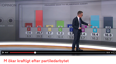 I den senaste mätningen från Novus var siffran över 22% och en ökning med över 6%-enheter på bara en månad. I TV4:s sammanvägda siffror (bilden ovan) där man tar genomsnittet av ett antal olika opinionsmätningar är moderaterna återigen med god marginal näst största parti, med 19,4%. I denna sammanvägning finns dock flera mätningar "kvar" som gjordes före partiledarskiftet.